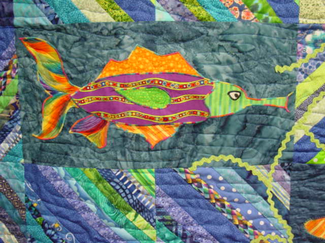 Sue sent me pictures of a HeartStrings quilt she recently donated to the Mayo Clinic. She wrote: “Louise Cohen sent a beautiful set of blocks. They were so coordinated they had to stay in a set and needed a special presentation . As soon as I saw them I thought of underwater .”