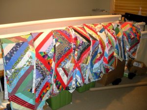 Nine HeartStrings tops arrived today from Sue and her Oroville/Chico California group which has been meeting once a month since January. They’ll be quilted and donated by me and other HeartStrings volunteers in the coming months.