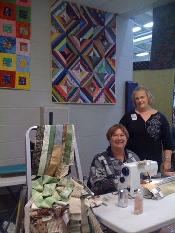 I visited a local quilt show in Hudson, WI today. Kathy was there (one of our HeartStrings members and also a member of the guild putting on the show) and I snapped her photo at their charity quilting booth. She’s the one standing. Notice the HeartStrings quilts?