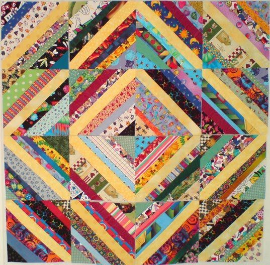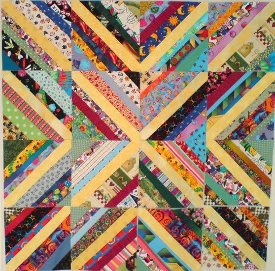 - Use a bright yellow center strip (cut 2 inches) and then add bright colored strings and strips to create blocks for children’s quilts. Other than the yellow center, these are made just like our guidelines. This is the set I’ve got started.