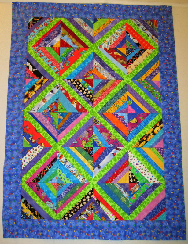 First, when choosing my strips and strings, I like to use a variety of tone on tone brights mixed up with novelty prints to make a fun quilt for a child.
