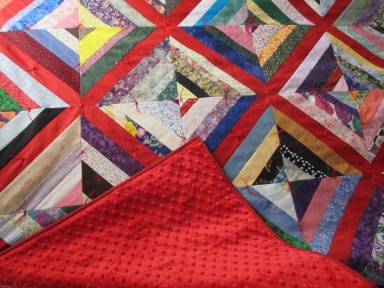 Once again Shannon Fabrics donated a bolt of their cuddle fabric to us to back quilts during the Maine sew-in. Here Rebecca is binding one after it was tied.