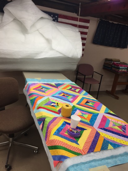 Ready to tie – look at this huge roll of batting Bev has set up for me.