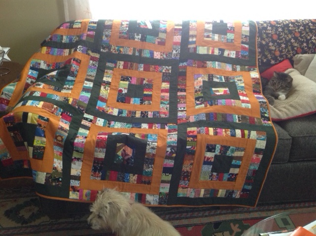 I finished and finally took pictures of the quilt I mentioned a month ago in the group. Perhaps others would like to see it although it is not our normal string quilt. There is a close up of the blocks and then a wider shot. Of course all the 4 legged ones tried to get in the photo.