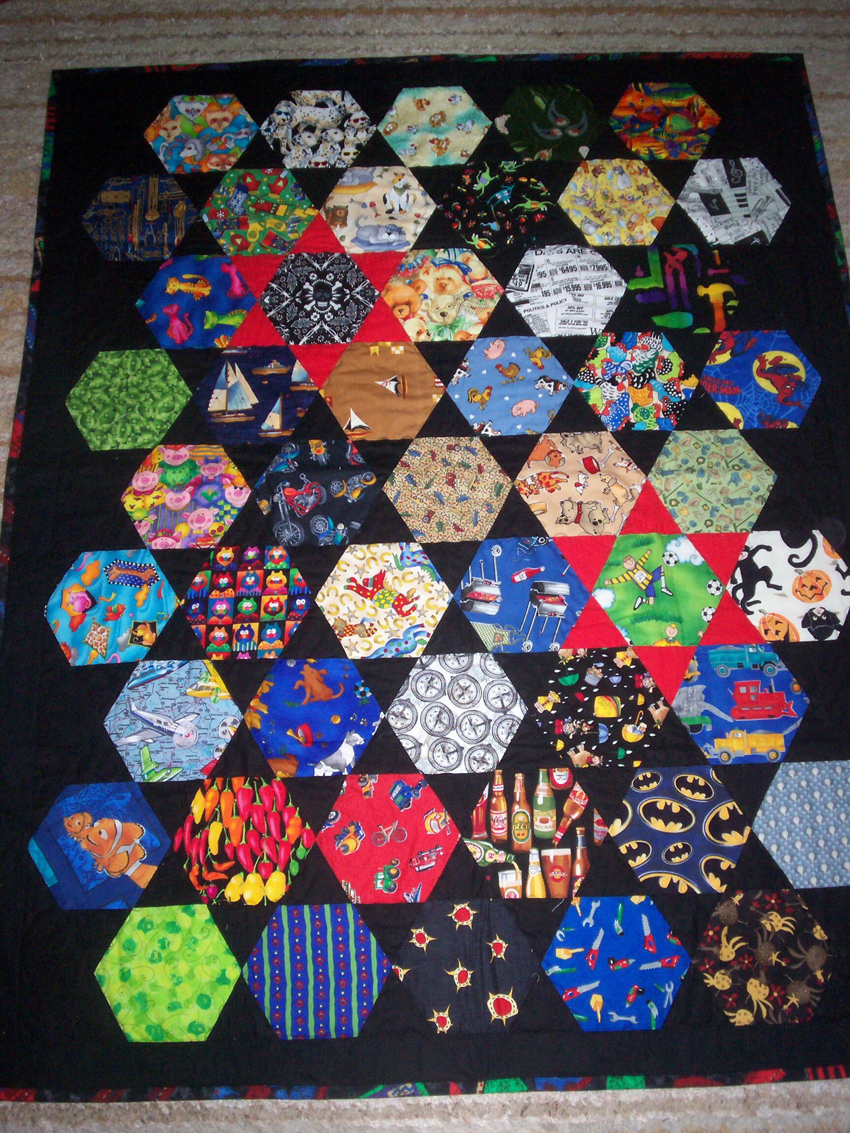 And, UFO 11 – Julie’s Hexies, an I-Spy top from Team Tassie. I added a black border to fill up the piece of backing I was using. Not sure who made the top (if it was Julie or someone else).