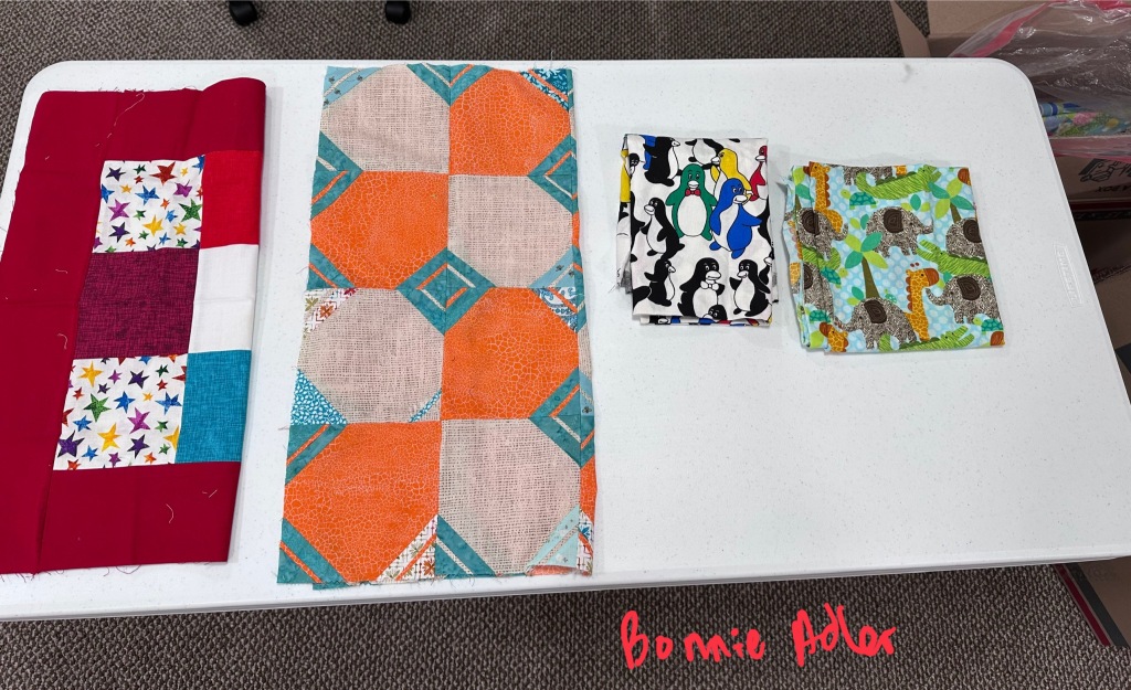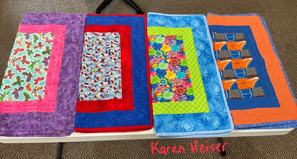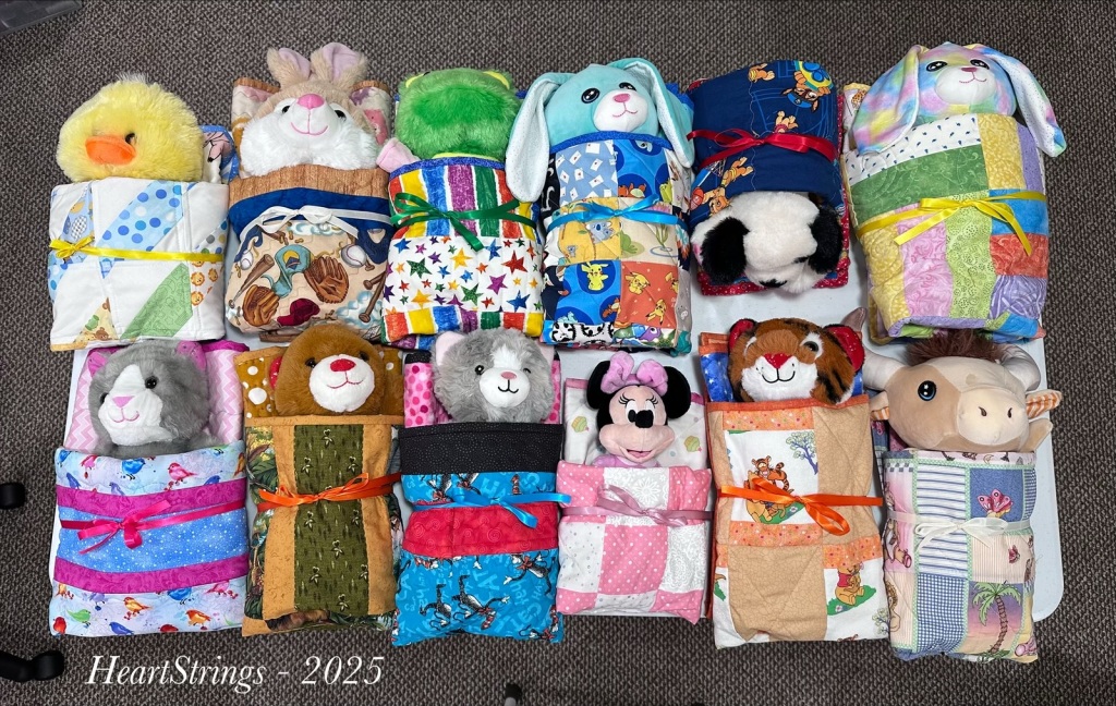 Some are finished quilts and some are tops that will be finished by one of our HeartStrings members. They’ll all be paired up with some cute critters and donated to kids in need.
