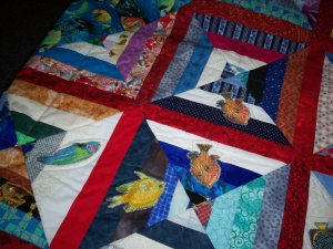 Then she fussy cut fish from printed fabrics and appliqued them on with sparkly thread. Quilted waves, swirling current and bubbles in the fishy border. It is gorgeous, the picture really doesn’t show how good it looks in real life.