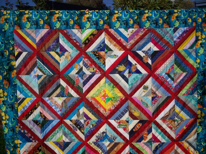 She has an autistic nephew called Lyndon who turned 21 last week. Lyndon loves red, and all things fish. Dee was full of enthusiasm after our Heartstring sewing day and decided to make Lyndon a Heartstring quilt. She used red centres, and all of the strings are inspired by the sea. Fish, dolphins, coral, swirls, water, shells, you get the picture.