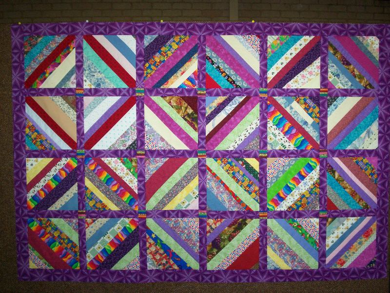 Wild at Heart is made from 24 assorted string blocks given to me for Heartstrings, by fellow Stitch by Stitch member Dora Carbone, sashed and bordered by me with a wild purple fabric from my stash. I cut the sashings and cornerstones 2 “, and the outer border 2 1’2″. Finished size 44″ x 66”.