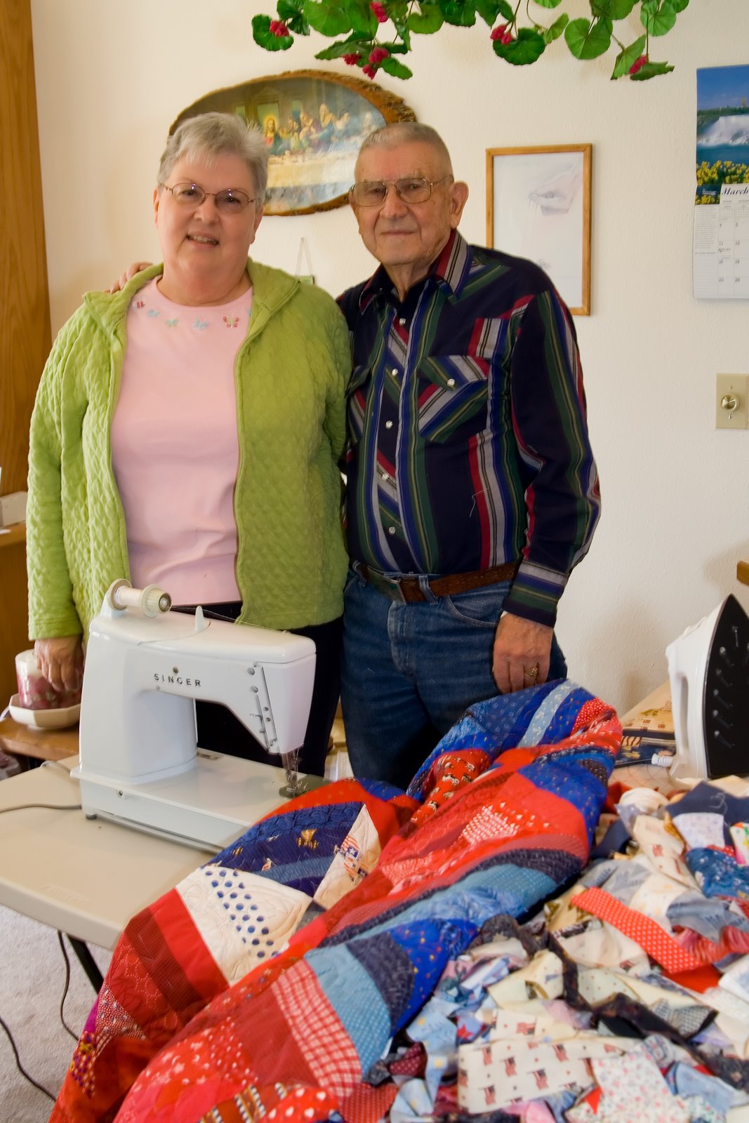 June emailed me photographs of her and Al and told me “I visited with Al and Helen (his wife) yesterday and showed them the finished quilt. They loved the quilt, the backing, the label and the whole idea. Each of them thanked me for getting him started making string blocks. Together they made a small lap quilt and tied it. They are going to make them for their sons, grandchildren and great-grandchildren.”