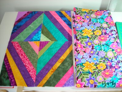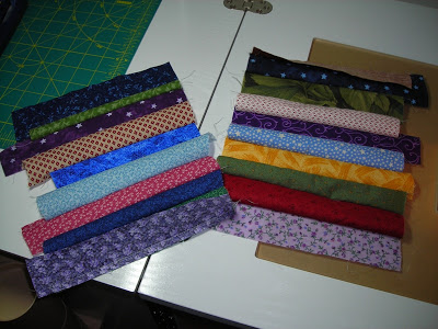 Although I love multicolored string quilts, I frequently experiment with color. The colors for this next quilt were chosen after reading a magazine article that discussed using fabrics from half the color wheel in a quilt. Well they used the *warm* side but I tend to like the *cool* side better so I pulled all my blue, green, purple and yellow strings for this quilt.
