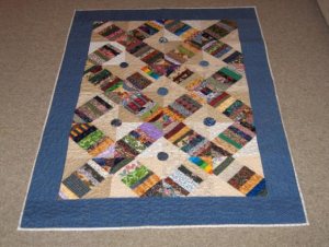 This 3rd quilt is made from leftover strips from quilts made for her grandsons and the blocks are only 4 inches square as she was working from small scraps. This quilt and the next are for the 3/4 year old boys at the centre.