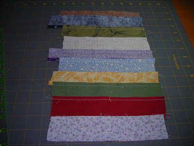 then I sewed two of these pairs together and had 4 strips, then sewed 2 of those and had 8 strips – last I added an additional pair. (As I’m sewing my pairs together, I’m careful to keep my left edge fairly even so that when I go to trim the section I won’t end up with a shorter strip not being long enough to square up.)