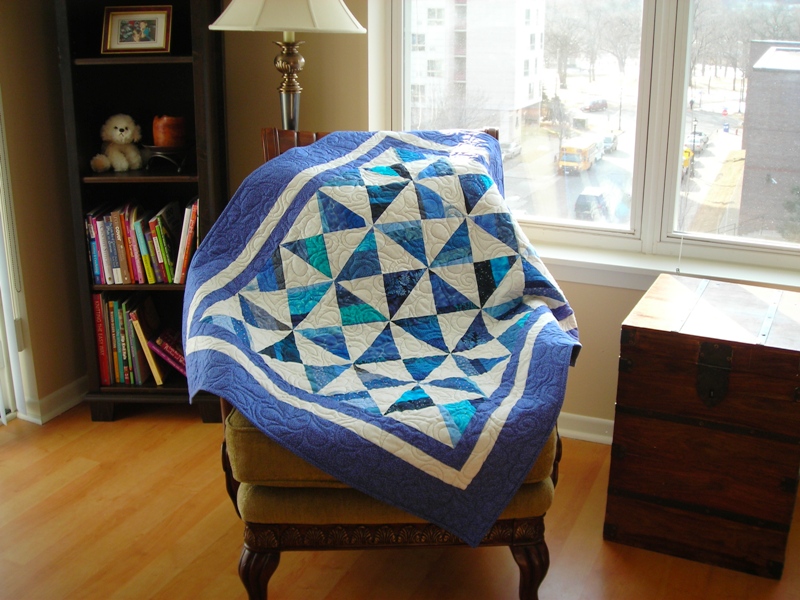 Another experiment in color led to this next quilt. I was making blue string blocks and as I got about 1/2 way through making the blocks I wasn’t sure I was going to like the quilt. I searched through my books and came across an Hourglass string quilt in Gwen Marston’s book Liberated Strings and decided that would work just fine.
