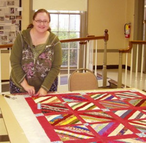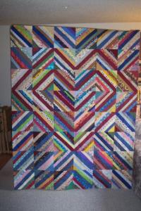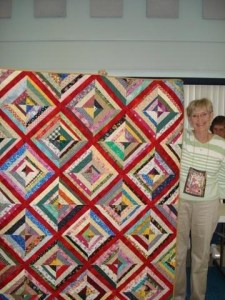 Kitty recently posted a photo of a HeartStrings quilt that she is donating to the Tampa VA hospital. She used the red center blocks made according to the guidelines on her quilt and it’s just beautiful. The top was quilted by a longarm quilter in her guild and she commented that she’d shown it at her guild’s show and tell and even included a photo for us to see.